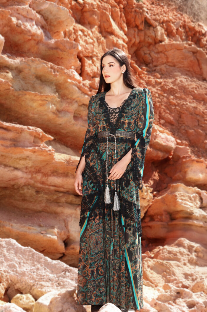 This striking ZINAS maxi kaftan dress exudes a refined bohemian aesthetic, ideal for island getaways and special occasions. Its vivid print is harmoniously paired with black lace accents, subtle fringes with tassels, and a decorative belt crafted from mixed textures and fabrics that emphasize the waist. The long padded sleeves add an elegant touch, making this kaftan suitable for transitional seasons such as spring and autumn. A true statement piece for beach weddings, summer events, or sophisticated resort looks.