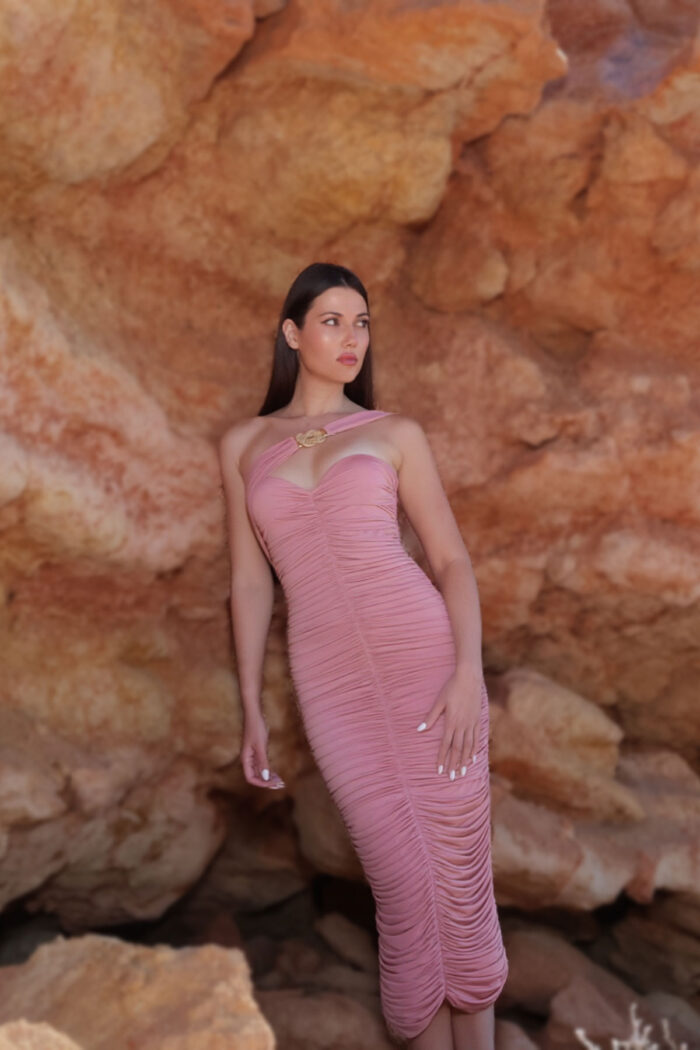 Bodycon midi dress with built-in bustier, striking ruching, one-shoulder design and a gold metal accent.