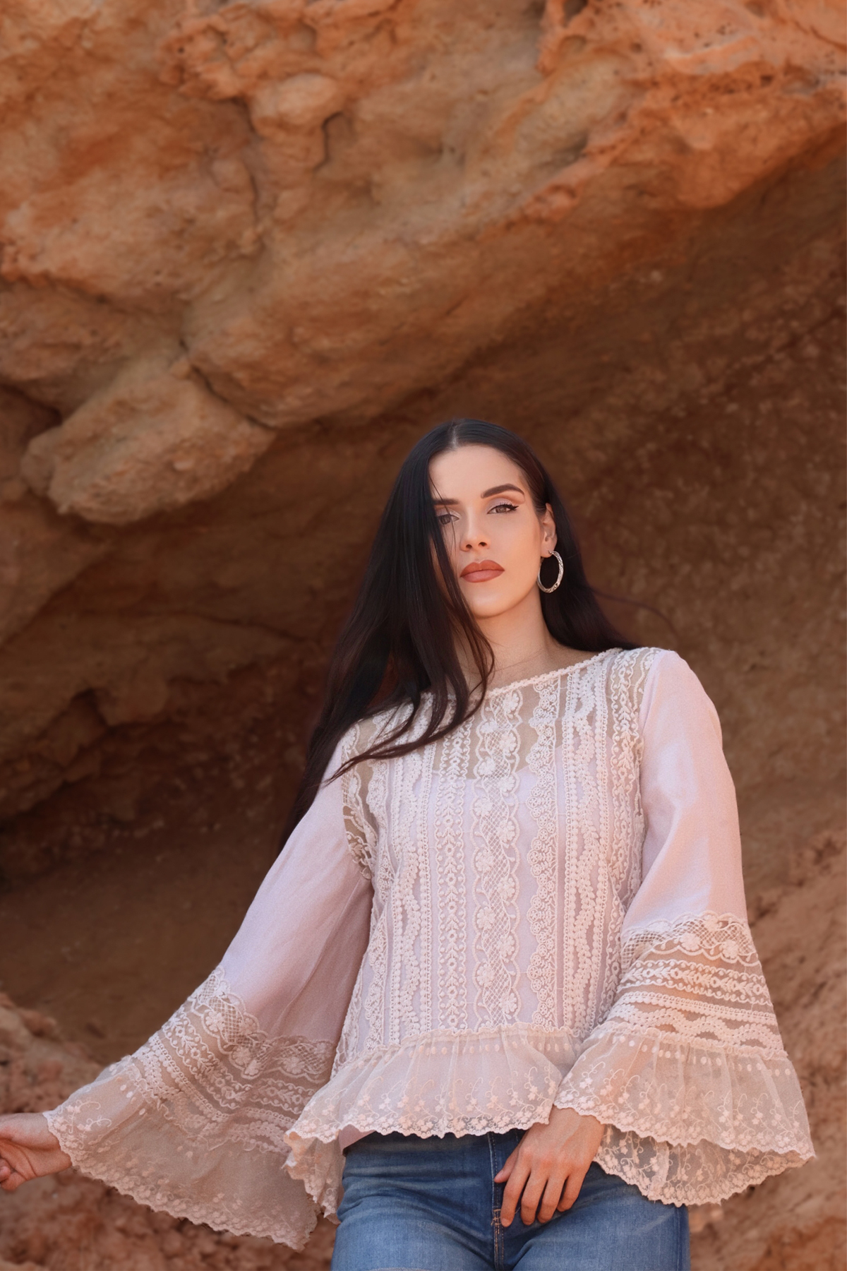 Αέρινη, ρομαντική και γεμάτη φινέτσα, αυτή η μπλούζα από δαντέλα και ύφασμα βουάλ είναι η απόλυτη μπλούζα της σεζόν. Τα μανίκια καμπάνα και το διακριτικό βολάν στο τελείωμα δημιουργούν μια αίσθηση αιθέριας κομψότητας. Έχει εντυπωσιακό πίσω άνοιγμα με δαντελένια διαφάνεια και χιαστί δεσίματα. Ιδανική επιλογή για απογευματινές εξόδους, events ή casual chic εμφανίσεις που συνδυάζουν θηλυκότητα και στυλ.
