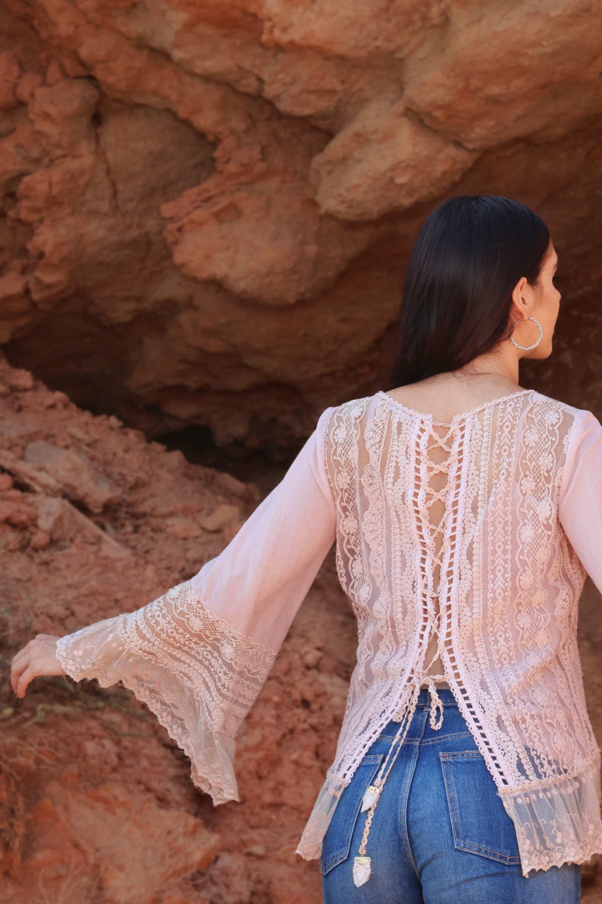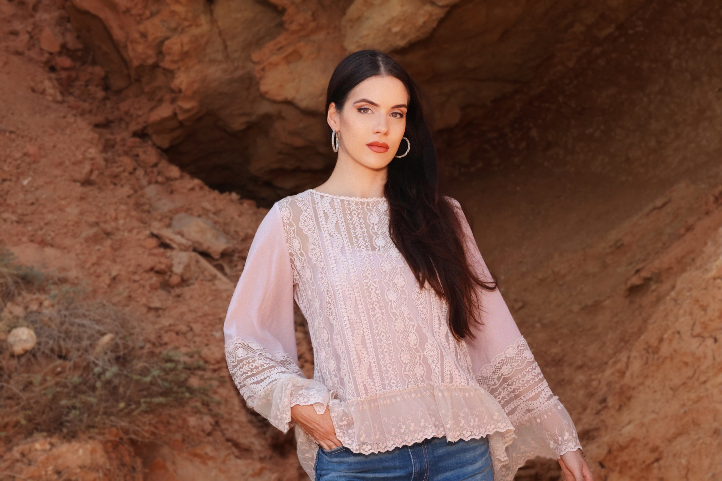 Αέρινη δαντελένια μπλούζα υφάσματος βουάλ με ιδιαίτερη πλάτη, χιαστί δεσίματα και vintage-romantic αισθητική