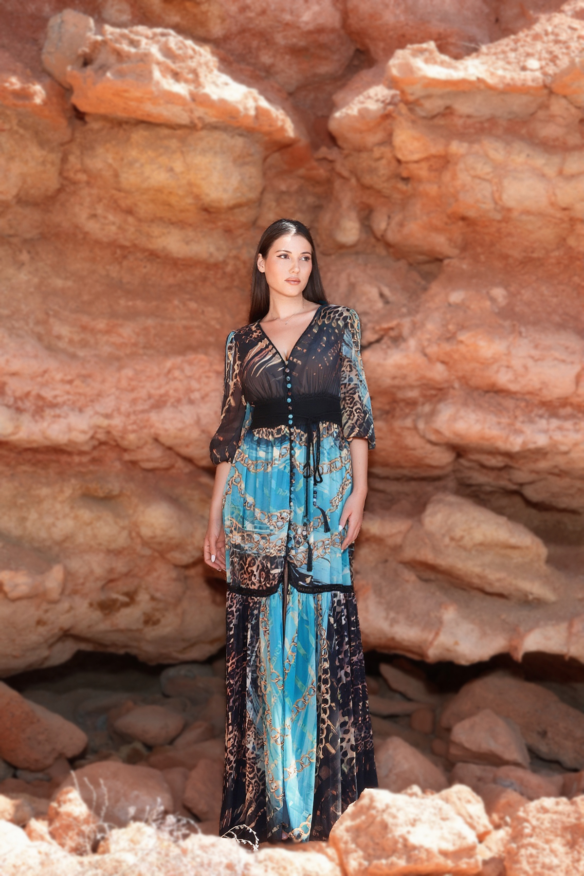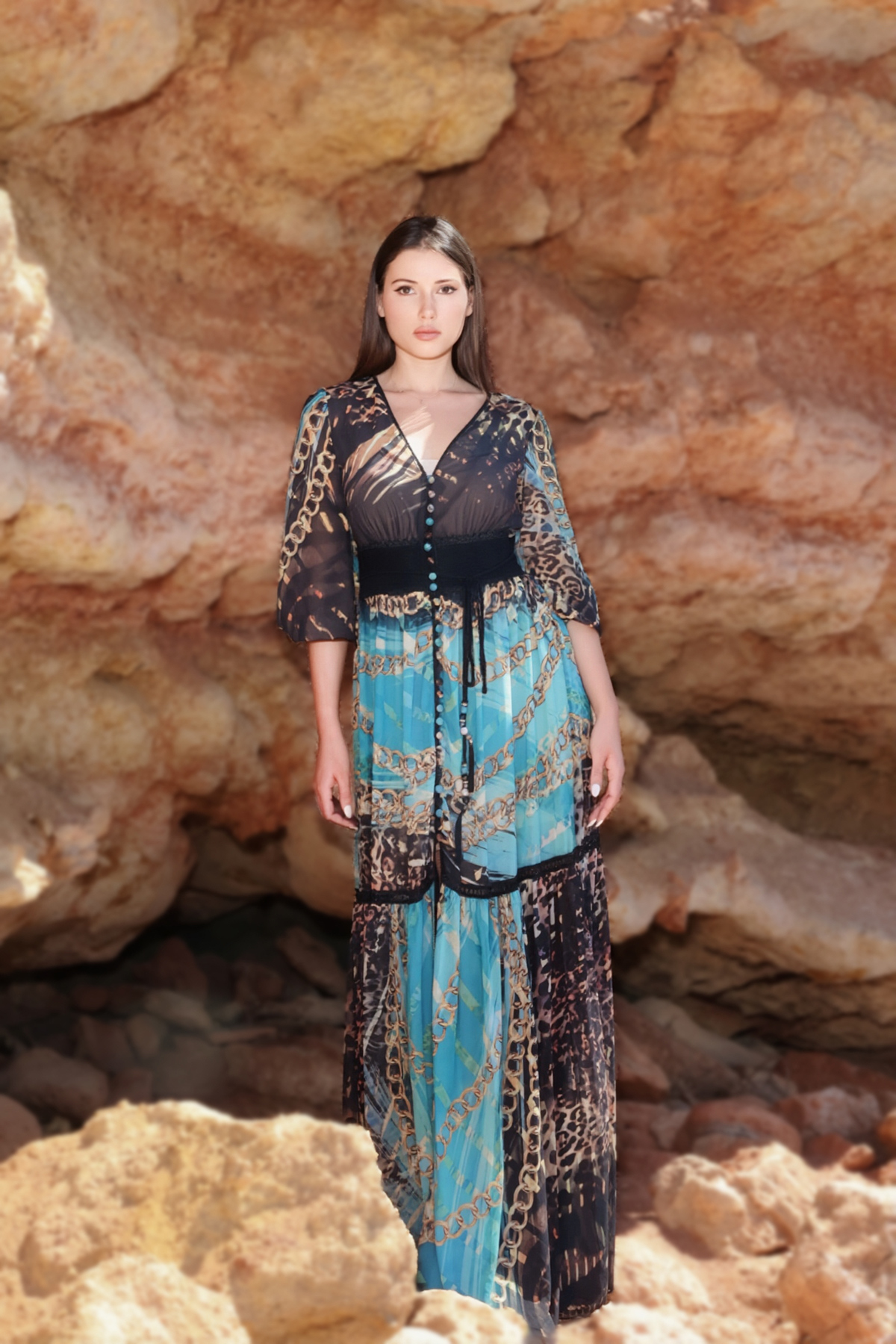 Μάξι ZINAS καφτάνι με εντυπωσιακό leopard-chain print, ιδανικό για luxury resort εμφανίσεις. Το καφτάνι είναι ημιδιάφανο, διαθέτει V-λαιμόκοψη, μακριά μανίκια και μαύρο λάστιχο στη μέση, δημιουργώντας την αίσθηση της ζώνης, αναδεικνύει τη σιλουέτα με τον πιο κομψό τρόπο. Διαθέτει εσωτερικό αποσπώμενο μπεζ μίνι φόρεμα για κάλυψη και άνεση. Ένα statement κομμάτι πολυτελής αισθητικής που συνδυάζει θηλυκότητα, στυλ και effortless glamour.