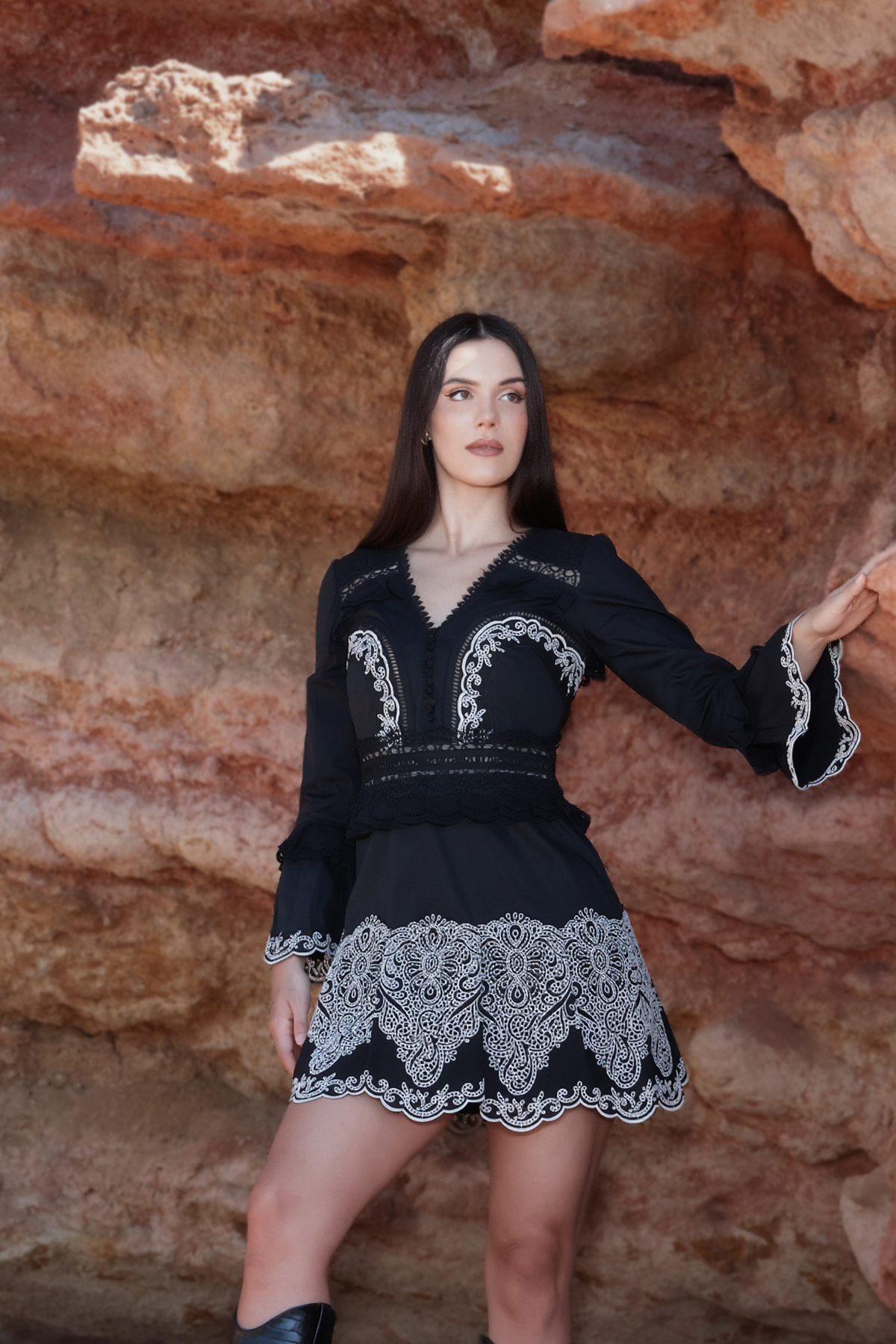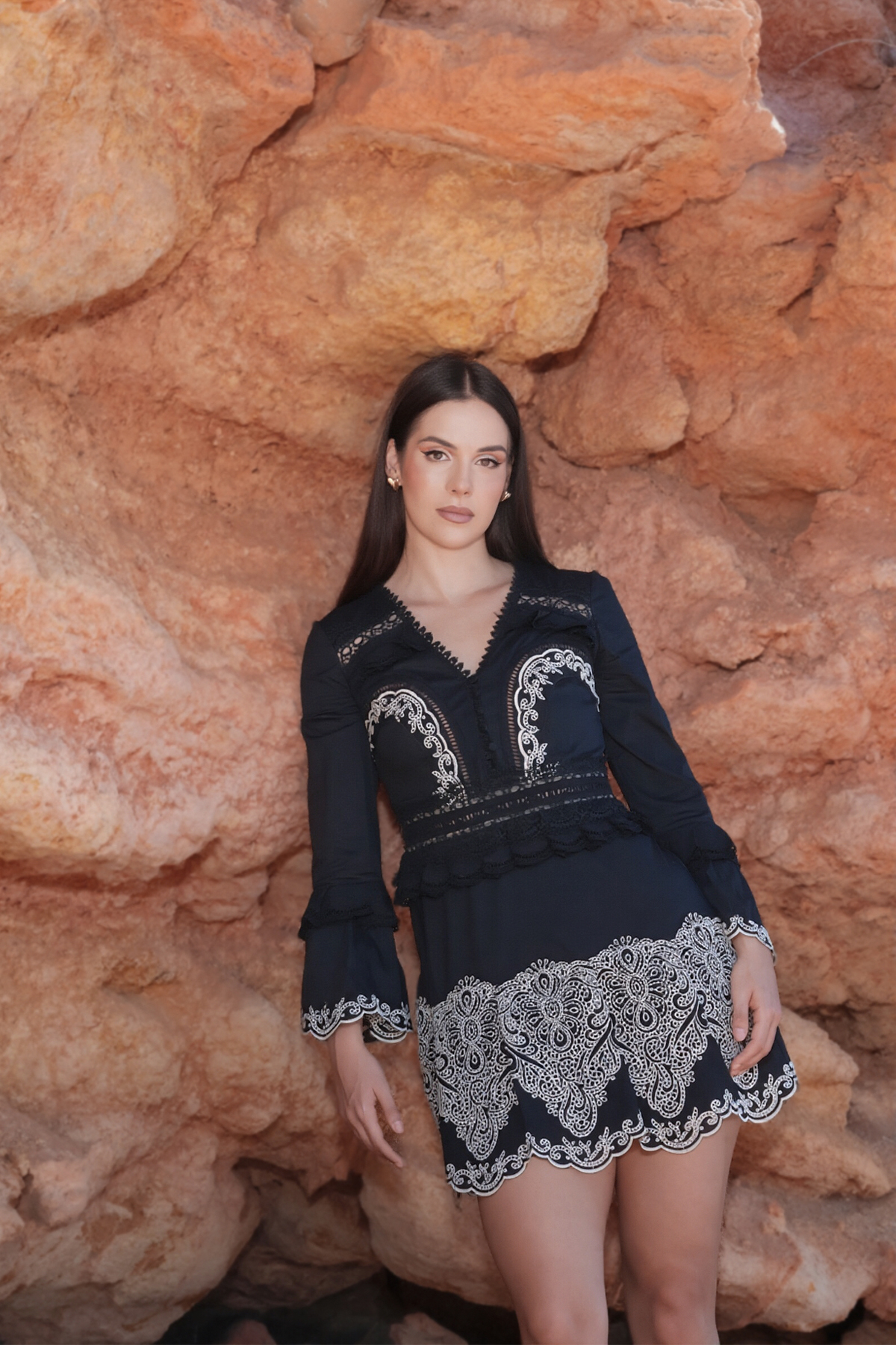 Μίνι φόρεμα ZINAS από ποπλίνα, διακοσμημένο με εκλεπτυσμένες δίχρωμες δαντέλες και δαντελωτά βολάν. Το φόρεμα διαθέτει καμπάνα μανίκια που προσθέτουν κίνηση και αέρα, ενώ οι δαντελένιες λεπτομέρειες σε συνδυασμό με τη δομημένη αλλά ελαφριά γραμμή της ποπλίνας, δημιουργούν ένα αρμονικό αποτέλεσμα που αναδεικνύει τη σιλουέτα. Ένα διαχρονικό μίνι φόρεμα με ρομαντική αισθητική.