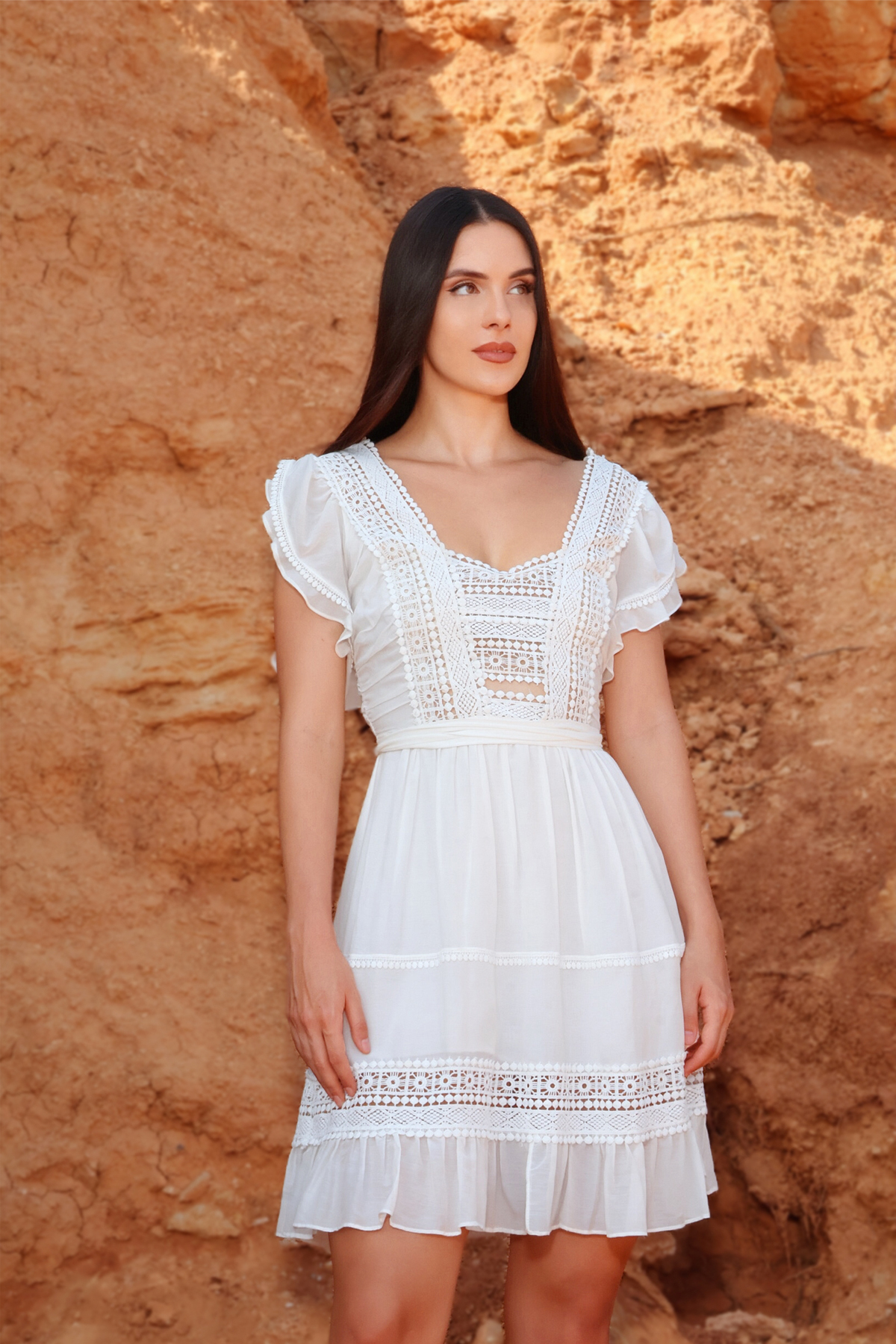 Φόρεμα ZINAS, από αέρινο ύφασμα βουάλ και διακοσμημένο με εκλεπτυσμένες δαντέλες στο πάνω μέρος του κορμού και στο τελείωμα. Τα βολάν στα μανίκια και στο κάτω μέρος του φορέματος χαρίζουν κίνηση και χάρη σε κάθε σας βήμα, προσδίδοντας μια αίσθηση ανεπιτήδευτης κομψότητας. Ιδανικό για κάθε περίσταση, από casual chic εμφανίσεις έως πιο ρομαντικές και country-inspired στιγμές, αυτό το φόρεμα συνδυάζει θηλυκότητα, άνεση και πολυτελή λεπτομέρεια.