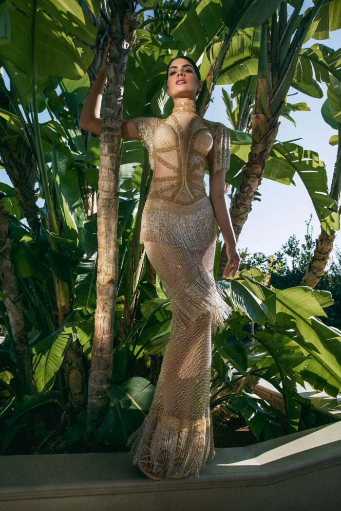Χρυσό μάξι διχτυωτό φόρεμα υψηλής ραπτικής, ένα μόνο αντίτυπο σε όλο τον κόσμο, χειροποίητης δημιουργίας Zinas, διακοσμημένο με χιλιάδες μικροκρυστάλλους , χρυσά κρόσσια από χάντρες και χρυσές τρέσες από κρύσταλλα και στρας, τοποθετημένες με το χέρι.