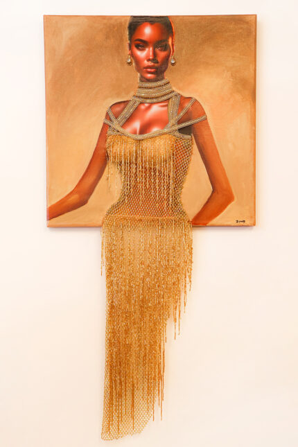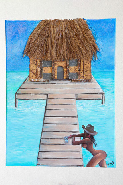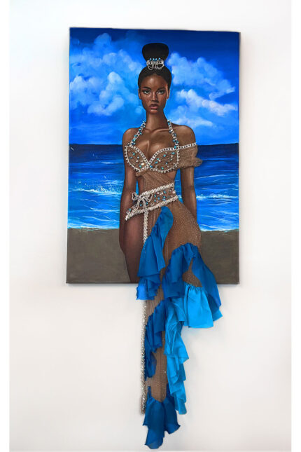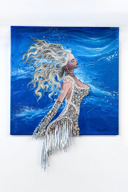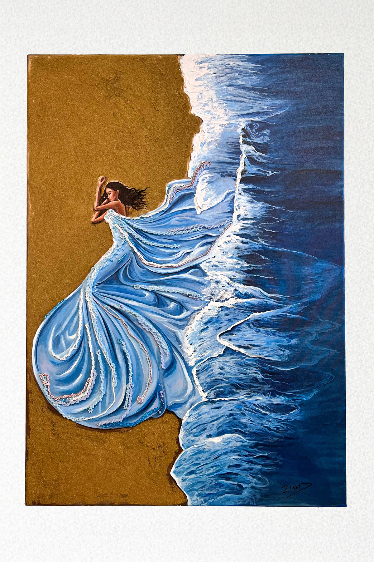 Ο πίνακας απεικονίζει μια γυναικεία μορφή ξαπλωμένη στην άκρη της θάλασσας, εκεί όπου η άμμος συναντά τα κύματα. Η σύνθεση συνδυάζει ζωγραφική στο χέρι με έντονη κίνηση και ρευστότητα, καθώς το φόρεμα της γυναίκας μοιάζει να ενώνεται με τη θάλασσα. Πάνω στον καμβά διακρίνονται χειροποίητα κεντημένα στοιχεία που ακολουθούν τις πτυχώσεις του φορέματος και τη ροή του νερού. Παρατηρούνται, χάντρες, πέρλες και λεπτές διακοσμητικές γραμμές, που προσδίδουν λάμψη, ανάγλυφη υφή και τρισδιάστατο βάθος. Το χειροποίητο κέντημα ενισχύει την αίσθηση κίνησης και μετατρέπει το έργο σε ένα ιδιαίτερο, καλλιτεχνικό αποτέλεσμα όπου η ζωγραφική συναντά τη χειροτεχνία.Το έργο αποτελεί παγκοσμίως μοναδικό δείγμα.