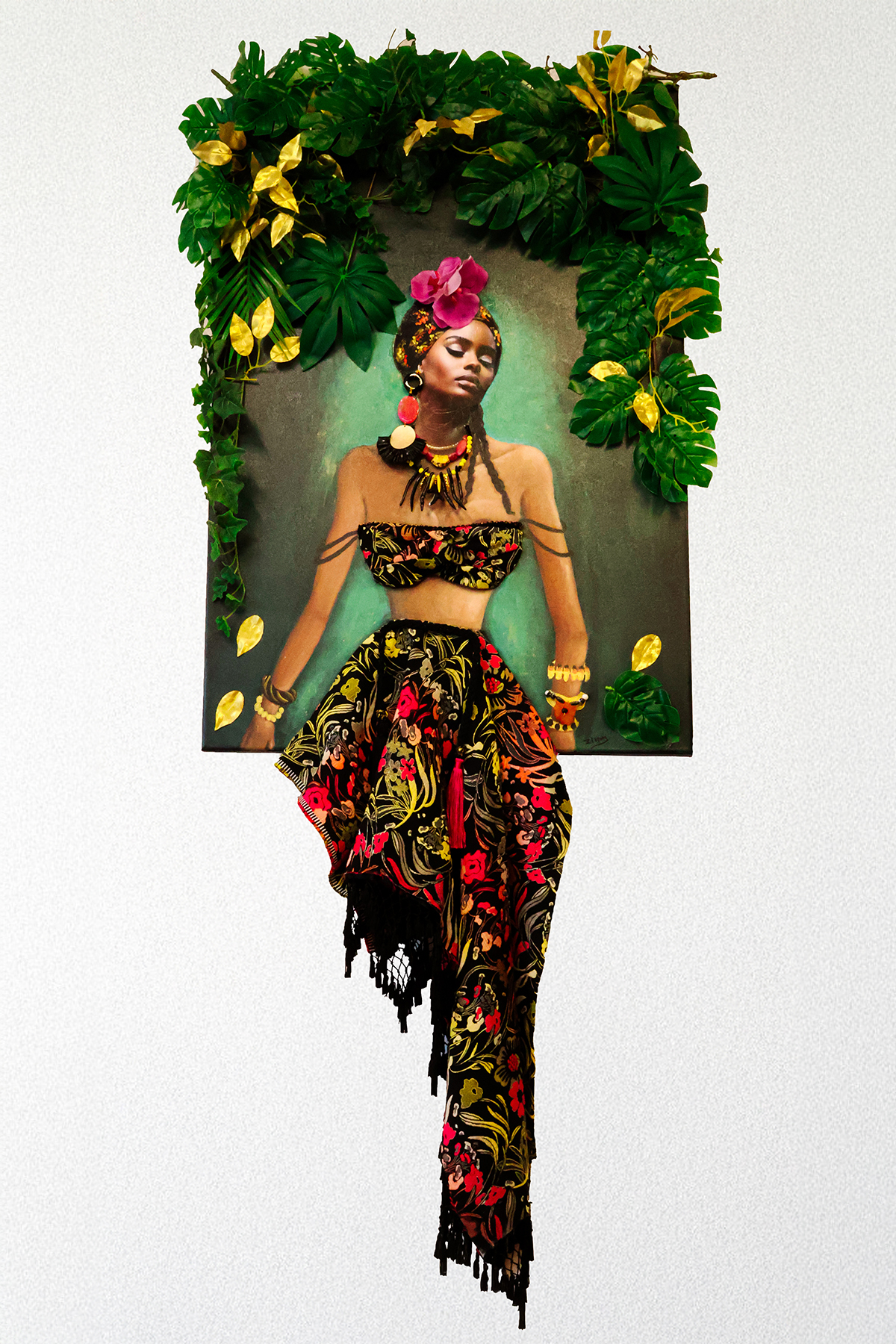 Όλα τα τρισδιάστατα στοιχεία του έργου είναι κεντημένα στο χέρι και αυτό γίνεται άμεσα αντιληπτό από την πλούσια υφή και τον όγκο τους. Το ένδυμα της γυναίκας είναι φτιαγμένο από κεντημένο ύφασμα με έντονα φυτικά και λουλουδένια μοτίβα σε μαύρο, κόκκινο, χρυσό και πράσινο. Το κέντημα είναι πυκνό και βαρυφορτωμένο, δημιουργώντας βάθος και κίνηση, ενώ το κάτω μέρος του ρούχου ξεφεύγει από το όριο του καμβά και πέφτει ελεύθερα, με κρόσσια και λεπτομέρειες που ενισχύουν την αίσθηση ρευστότητας και φυσικής κίνησης.