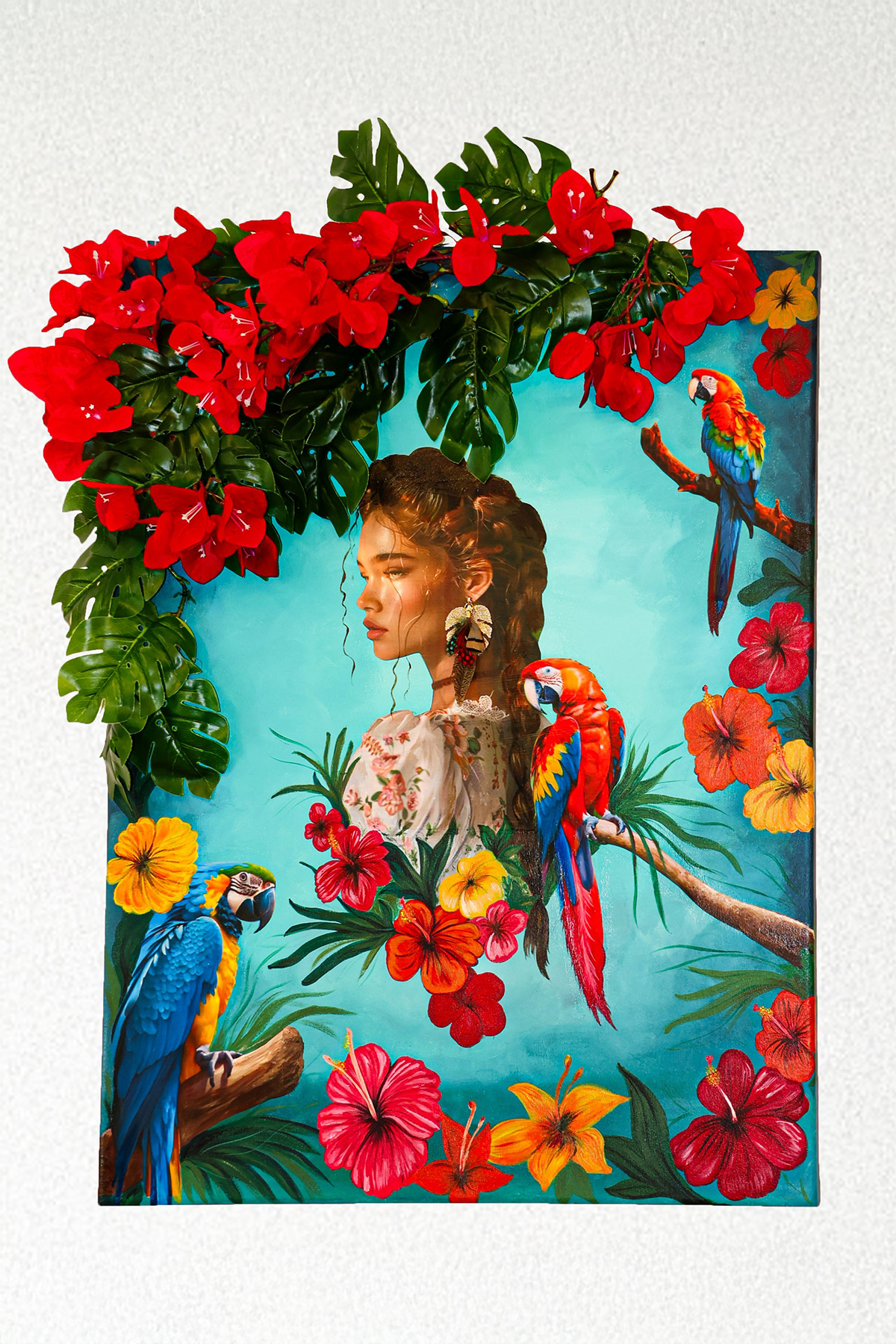 Χειροποίητος πίνακας μικτής τεχνικής με γυναικεία μορφή σε τροπικό, ονειρικό περιβάλλον, όπου η ζωγραφική συνδυάζεται με κεντημένα φύλλα, λουλούδια και υφασμάτινες λεπτομέρειες που προεξέχουν από τον καμβά, δημιουργώντας τρισδιάστατη υφή και εξωτική ατμόσφαιρα· παγκοσμίως μοναδικό δείγμα τέχνης.