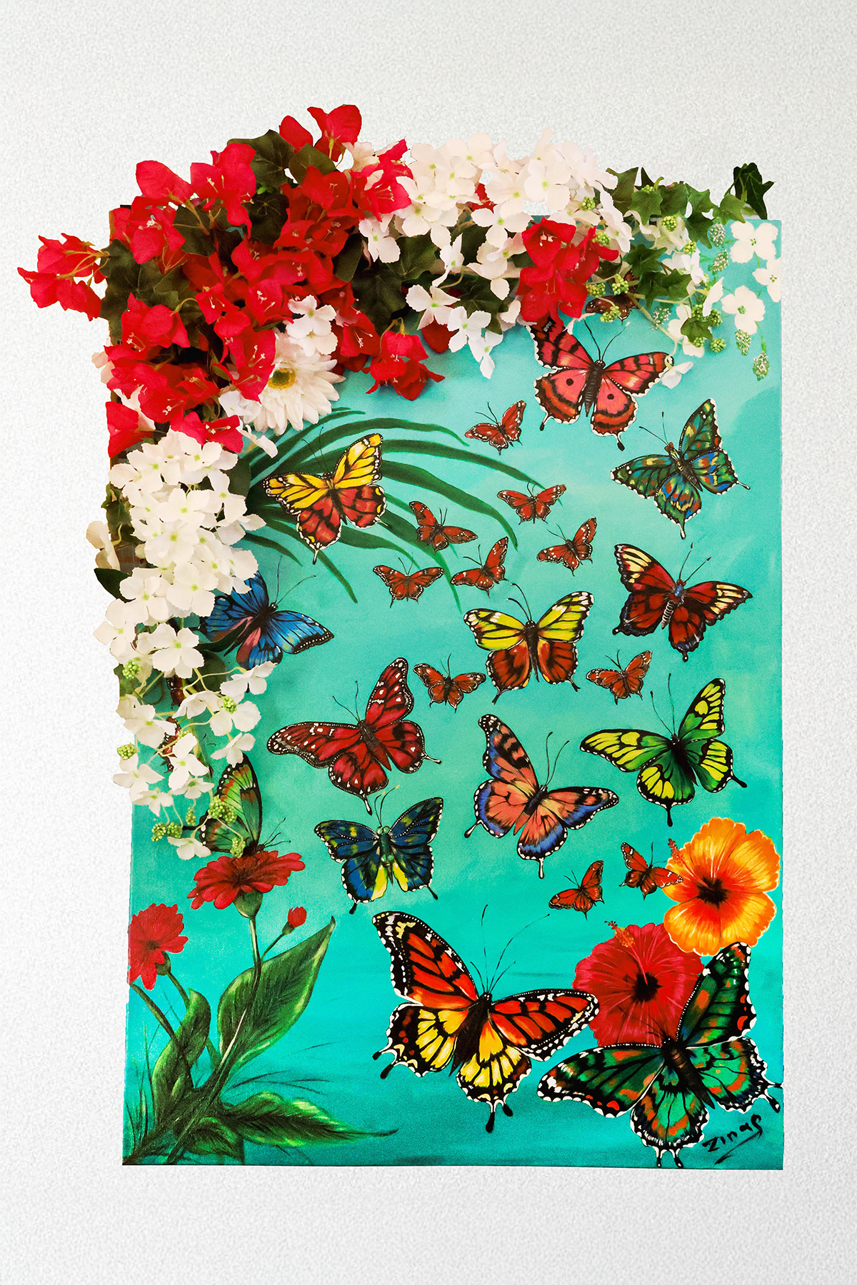 Χειροποίητος πίνακας που απεικονίζει έναν ονειρικό κήπο με πεταλούδες σε τιρκουάζ φόντο, όπου η ζωγραφική συνδυάζεται με χειροποίητα κεντημένα λουλούδια και διακοσμητικά στοιχεία, δημιουργώντας ανάγλυφη υφή, βάθος και κίνηση· παγκοσμίως μοναδικό δείγμα τέχνης.