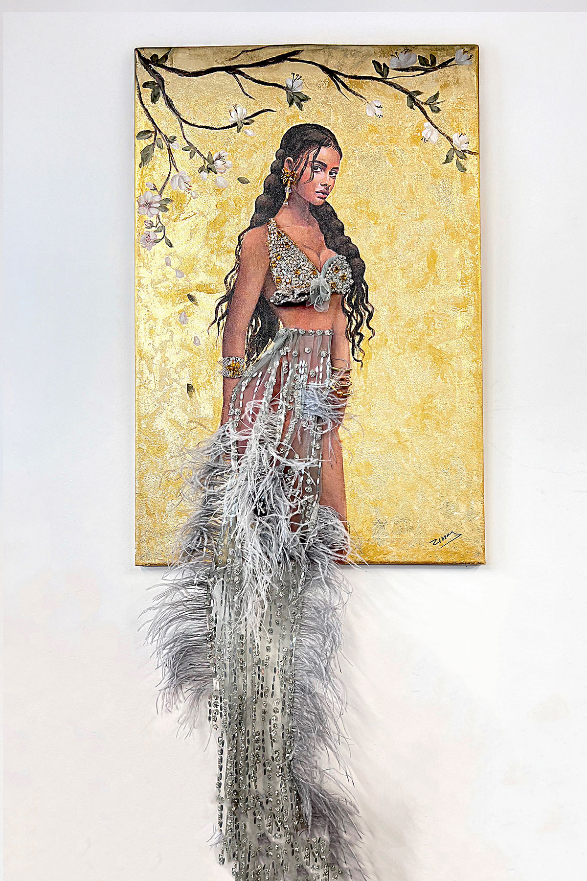 Ο πίνακας απεικονίζει μια εντυπωσιακή γυναικεία μορφή σε χρυσό φόντο, που θυμίζει ιερατική και πολυτελή ατμόσφαιρα. Η ζωγραφική συνδυάζεται με εκατοντάδες διαμαντάκια και κρύσταλλα, όλα κεντημένα στο χέρι απευθείας πάνω στον καμβά που δημιουργούν κίνηση και λάμψη, αναδεικνύοντας τη θηλυκότητα, τη δύναμη και την κομψότητα της μορφής.. Το ένδυμά της συνδυάζει ζωγραφική με κεντημένο ύφασμα και πούπουλα που κατεβαίνουν έξω από το πλαίσιο του πίνακα, δημιουργώντας έντονη λάμψη, υφή και τρισδιάστατη αίσθηση. Πρόκειται για ένα παγκοσμίως μοναδικό δείγμα τέχνης.