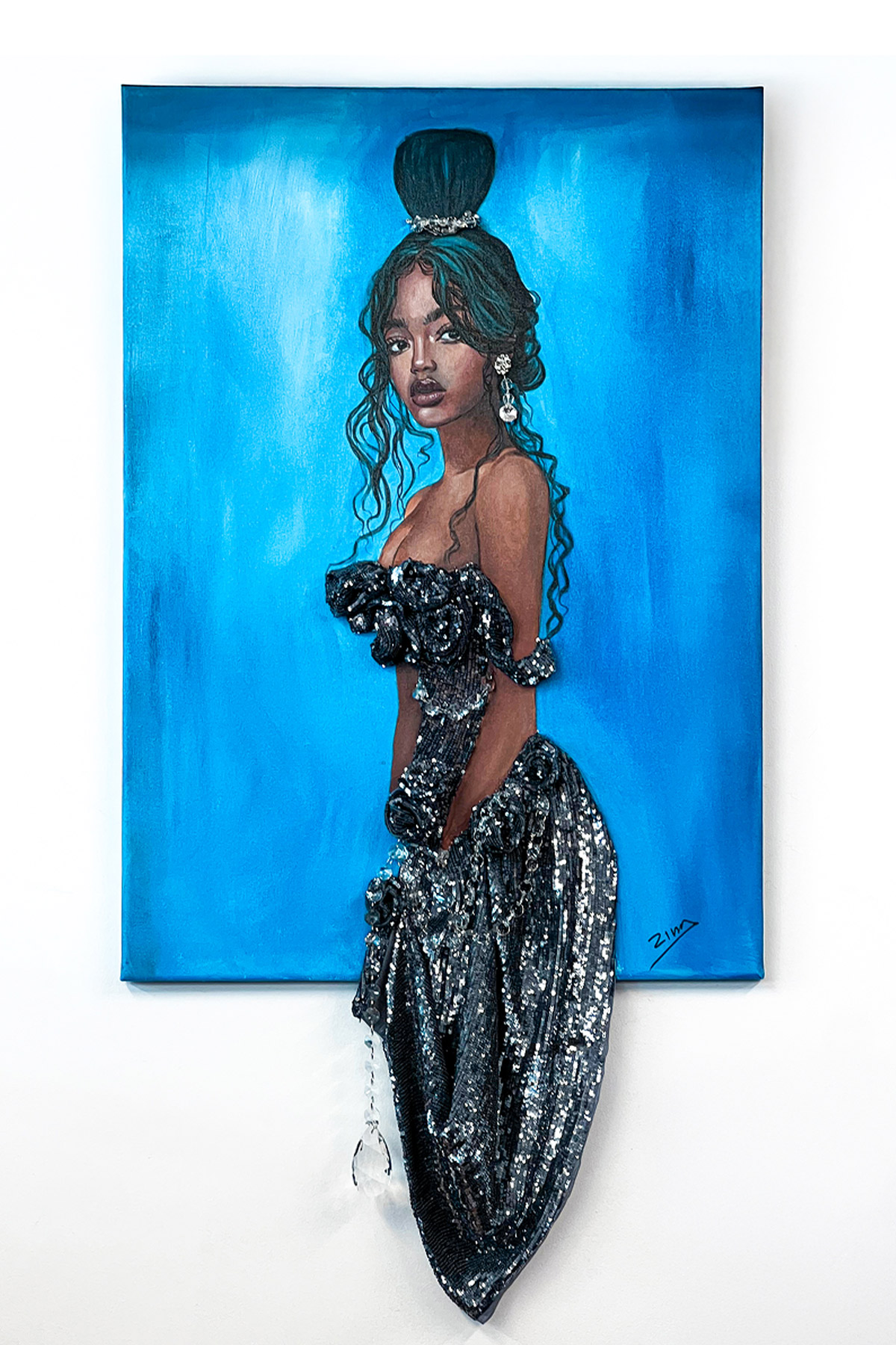 Ο πίνακας απεικονίζει μια κομψή γυναικεία μορφή σε έντονο μπλε φόντο. Το σώμα της είναι κεντημένο στο χέρι με λαμπερό παγιετίνο ύφασμα, ενώ διαμαντάκια και εντυπωσιακά σκουλαρίκια προσθέτουν λάμψη και πολυτέλεια. Η σύνθεση αποπνέει δύναμη και φινέτσα και αποτελεί παγκοσμίως μοναδικό δείγμα τέχνης