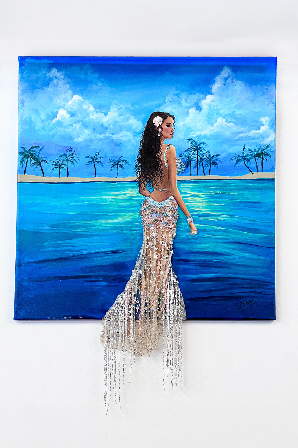 Ο πίνακας απεικονίζει μια γυναικεία μορφή σε θαλάσσιο τοπίο, ζωγραφισμένο στο χέρι, με έντονα μπλε και τιρκουάζ χρώματα που αποπνέουν αίσθηση καλοκαιριού και ηρεμίας. Πάνω στον καμβά παρατηρούνται χειροποίητα κεντημένα στοιχεία: κρύσταλλα, διακοσμητικές πέτρες, χάντρες και λεπτές αλυσίδες, που σχηματίζουν ένα εντυπωσιακό φόρεμα. Τα υλικά προσδίδουν λάμψη, κίνηση και τρισδιάστατη υφή, καθώς το κέντημα ξεπερνά τα όρια του πίνακα και «ρέει» προς τα κάτω, ενισχύοντας την αίσθηση πολυτέλειας και μοναδικότητας του έργου.Το έργο αποτελεί παγκοσμίως μοναδικό δείγμα.