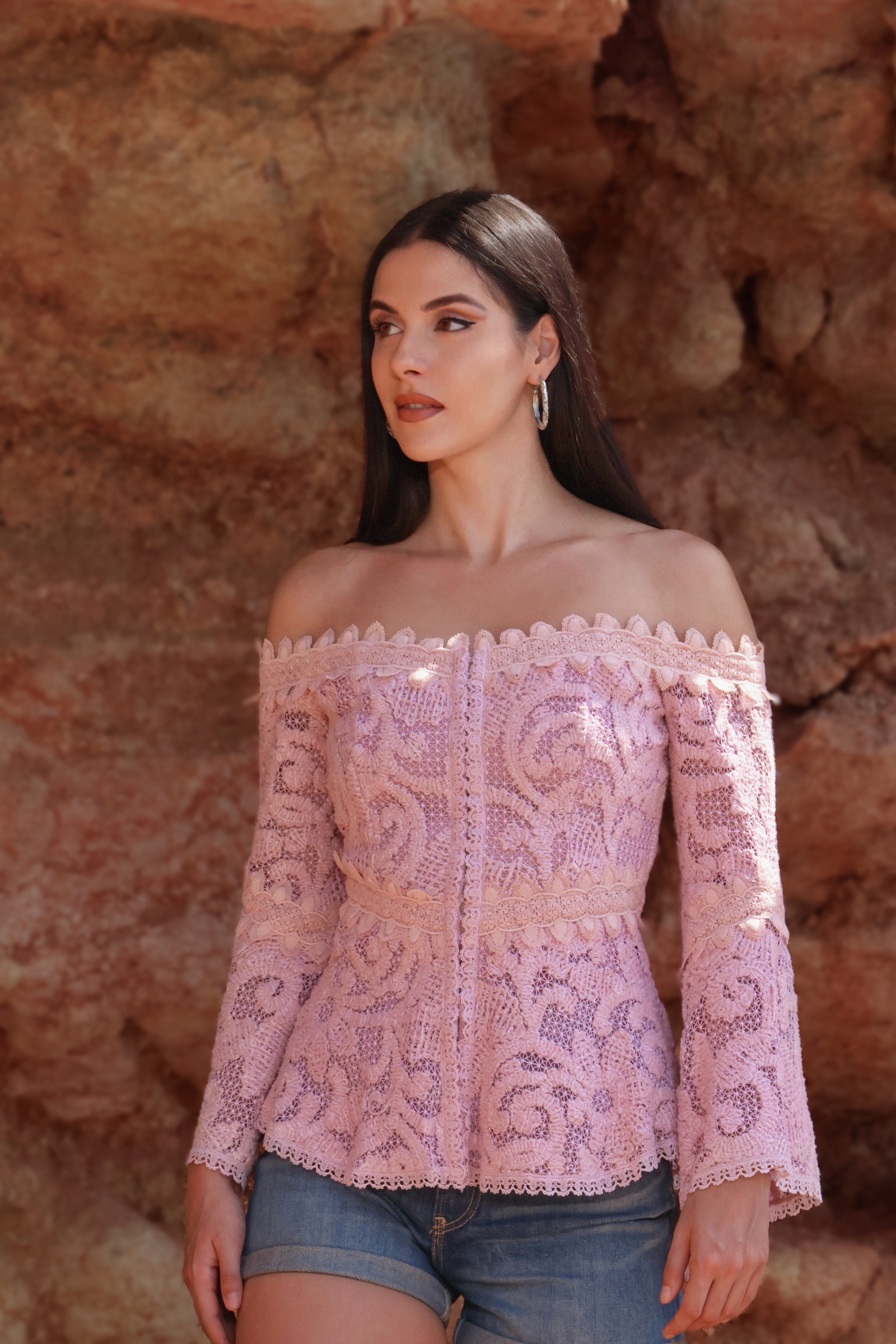 Off-Shoulder κορσές από δαντέλα κιπούρ Pink