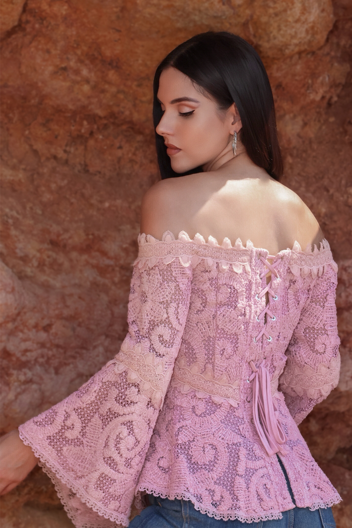 Θηλυκή και άκρως κομψή, αυτή η off-shoulder μπλούζα με ενσωματωμένο κορσέ και ανάγλυφη δαντέλα κιπούρ, είναι η επιτομή της ρομαντικής φινέτσας. Το περίτεχνο δαντελένιο ύφασμα με ανάγλυφα μοτίβα και τα μανίκια σε στυλ καμπάνας ,χαρίζουν ρομαντική διάθεση, ενώ η εφαρμογή που προσδίδει ο κορσές, αναδεικνύει τη μέση δίνοντας σχήμα. Ιδανική για απογευματινές βόλτες, events ή chic εμφανίσεις.
