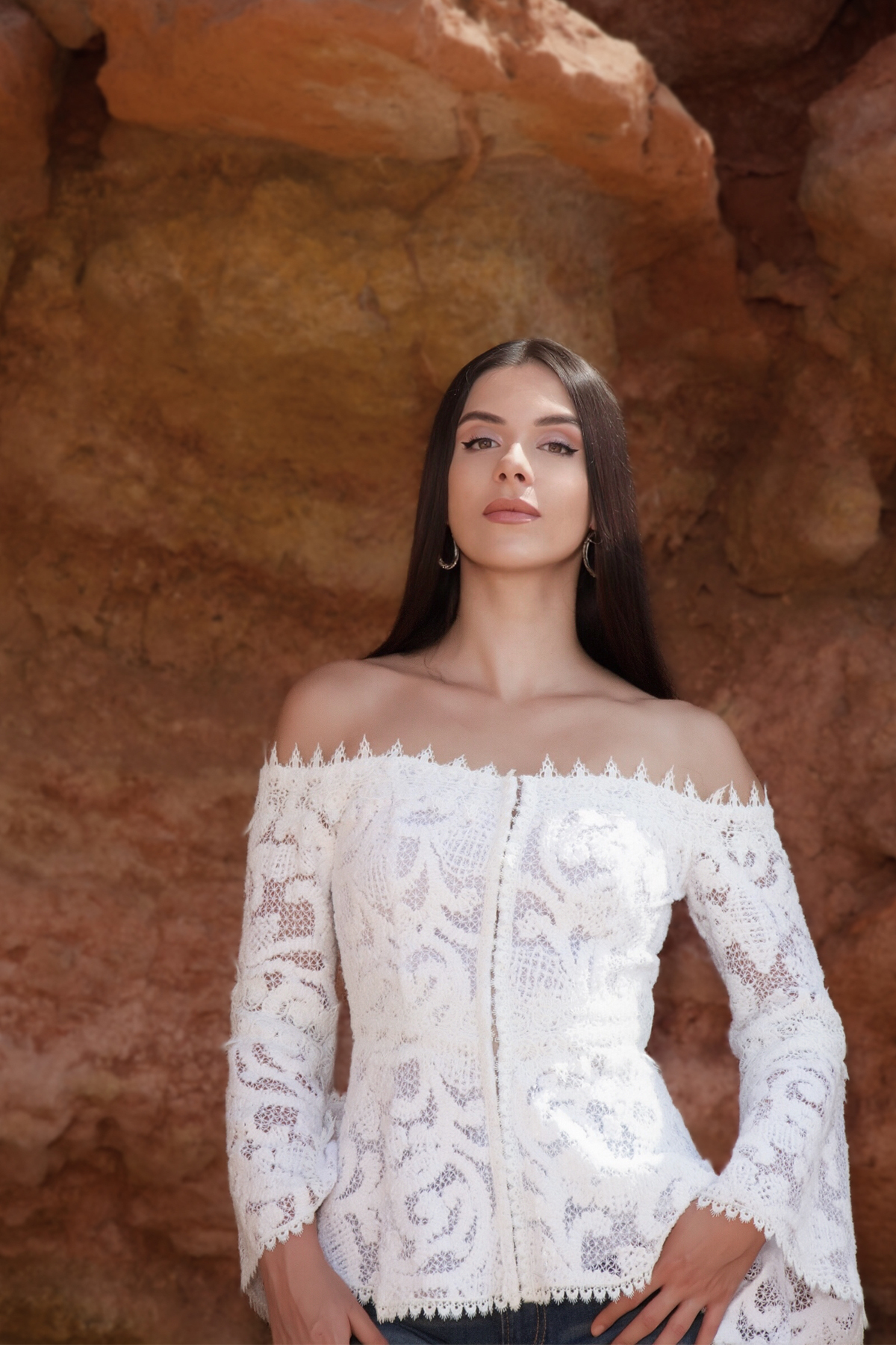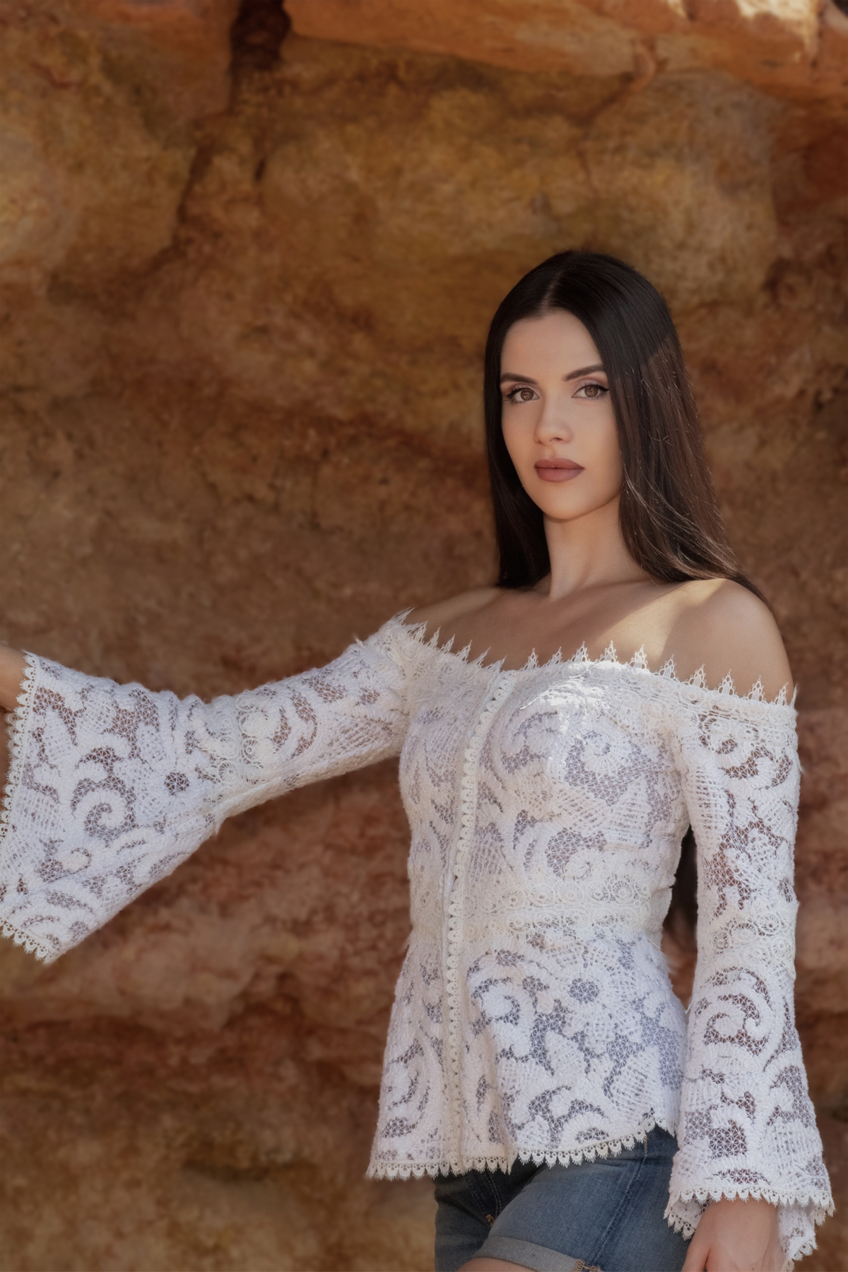 Θηλυκή και άκρως κομψή, αυτή η off-shoulder μπλούζα με ενσωματωμένο κορσέ και ανάγλυφη δαντέλα κιπούρ, είναι η επιτομή της ρομαντικής φινέτσας. Το περίτεχνο δαντελένιο ύφασμα με ανάγλυφα μοτίβα και τα μανίκια σε στυλ καμπάνας ,χαρίζουν ρομαντική διάθεση, ενώ η εφαρμογή που προσδίδει ο κορσές, αναδεικνύει τη μέση δίνοντας σχήμα. Ιδανική για απογευματινές βόλτες, events ή chic εμφανίσεις.