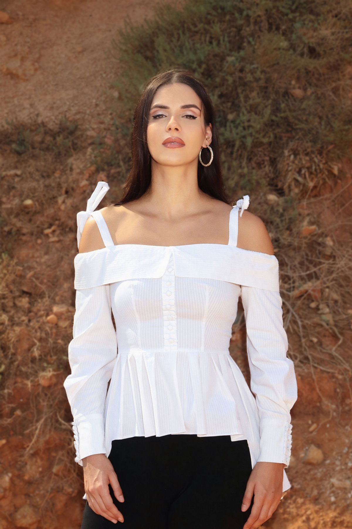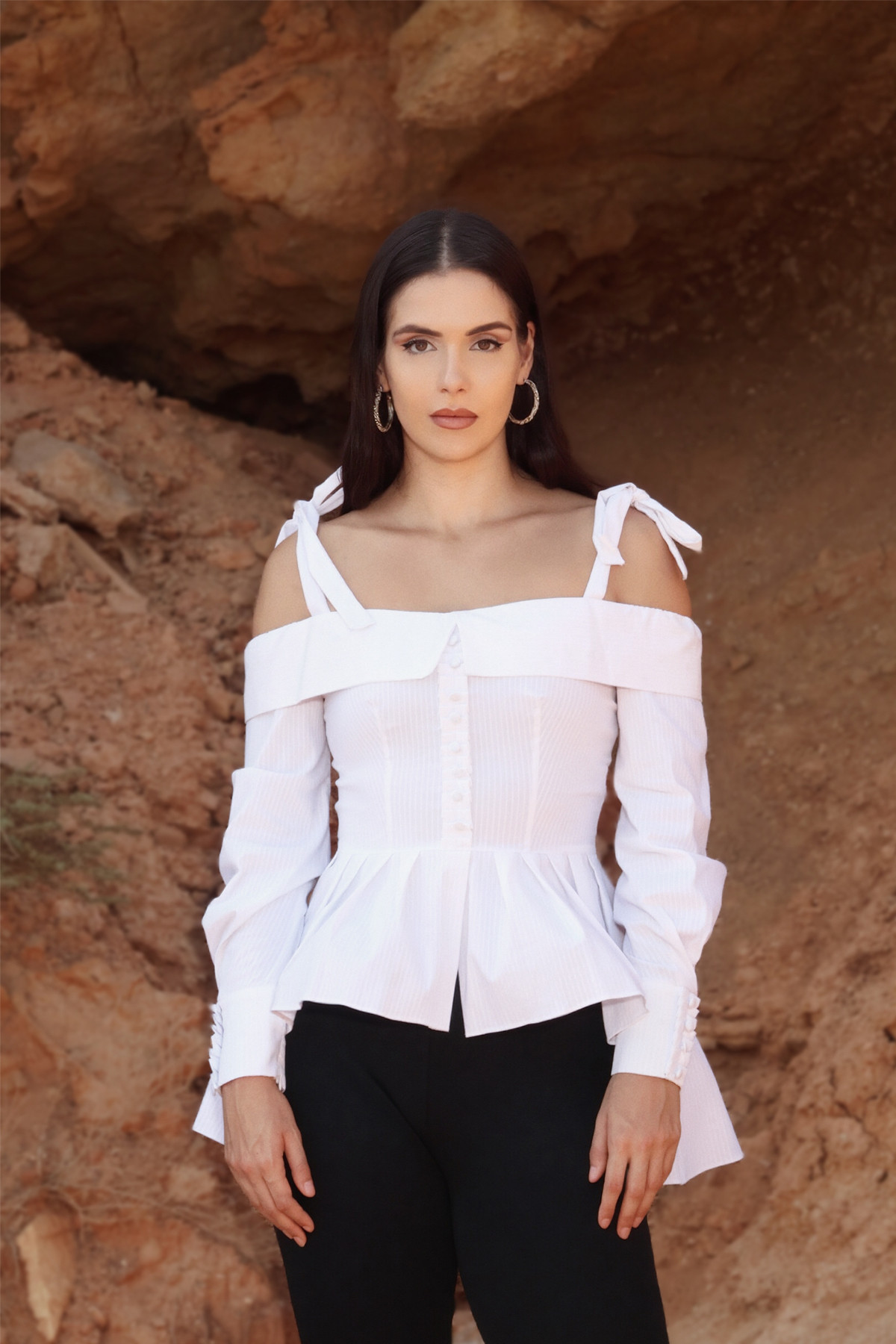 Off shoulder πουκάμισο από ύφασμα ποπλίνας με τιράντες που δένουν στους ώμους. Το πουκάμισο είναι πιο κοντό στην μπροστινή πλευρά και πιο μακρύ στο πίσω μέρος. Είναι μεσάτο και στη συνέχεια ανοίγει, προσδίδοντας κίνηση στο ρούχο και σχήμα στο σώμα. Είναι ιδανικό πουκάμισο για chic εμφανίσεις στο γραφείο και για βόλτα από το πρωί μέχρι και το βράδυ για casual ή και πιο επίσημες εμφανίσεις.