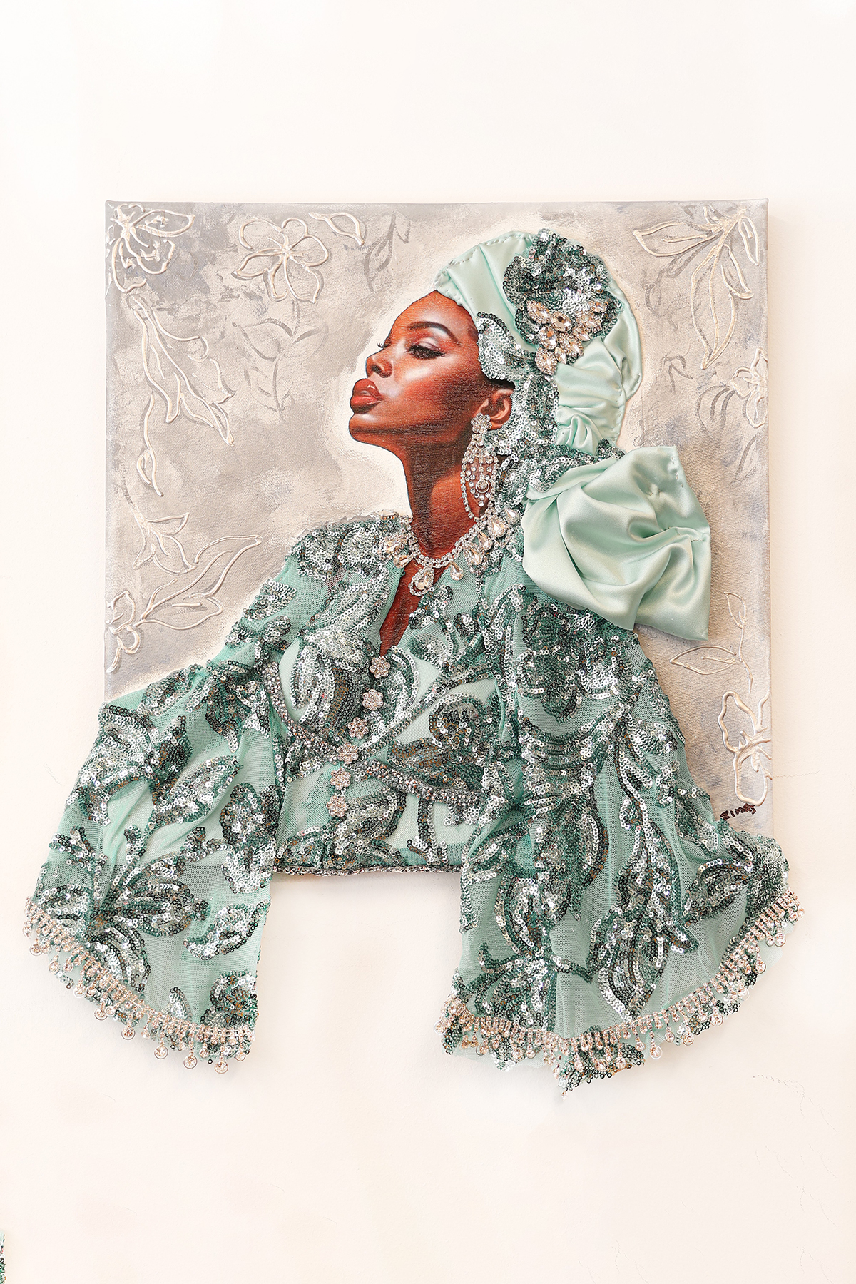 Στο κεφάλι της μορφής δεσπόζει ένα κεντημένο τουρμπάνι από το ίδιο ύφασμα, δεμένο με τρόπο γλυπτικό. Πάνω του ξεχωρίζει ένα μεγάλο, ανάγλυφο λουλούδι, φτιαγμένο επίσης με κέντημα, χάντρες και παγιέτες, το οποίο λειτουργεί ως κεντρικό διακοσμητικό στοιχείο και σύμβολο θηλυκότητας και δύναμης. Τα κοσμήματα, όπως το κολιέ και τα σκουλαρίκια, είναι κεντημένα στο χέρι με λεπτομέρεια και ακρίβεια, γεφυρώνοντας οπτικά το ζωγραφισμένο σώμα με τα υφασμάτινα και ανάγλυφα στοιχεία.