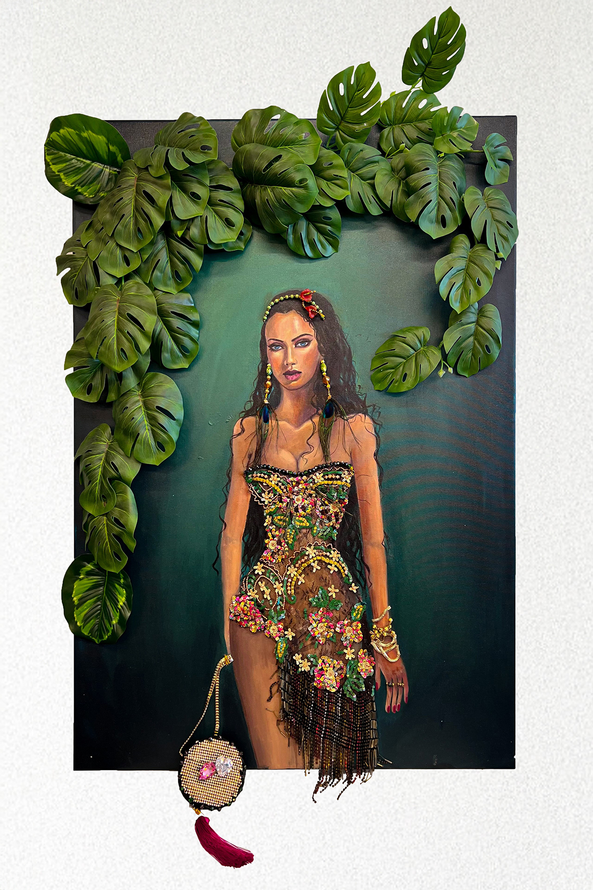 Χειροποίητος πίνακας με γυναικεία μορφή σε τροπικό περιβάλλον, όπου η ζωγραφική συνδυάζεται με κεντημένες χάντρες, κρύσταλλα, πέρλες, αλυσίδες και υφάσματα, δημιουργώντας τρισδιάστατη υφή, βάθος και έντονη φυσική παρουσία· παγκοσμίως μοναδικό δείγμα τέχνης.